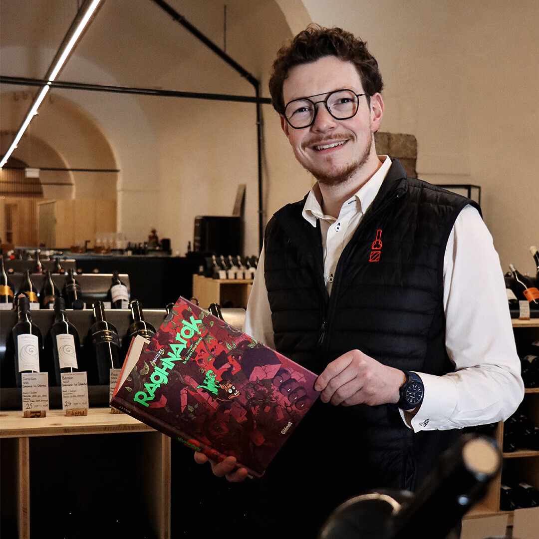 Pour débuter ce concours, Léo Macquat, gérant du commerce Les Caves du Château, met en avant l'ultime livre de la série de bande dessinée Raghnarok.